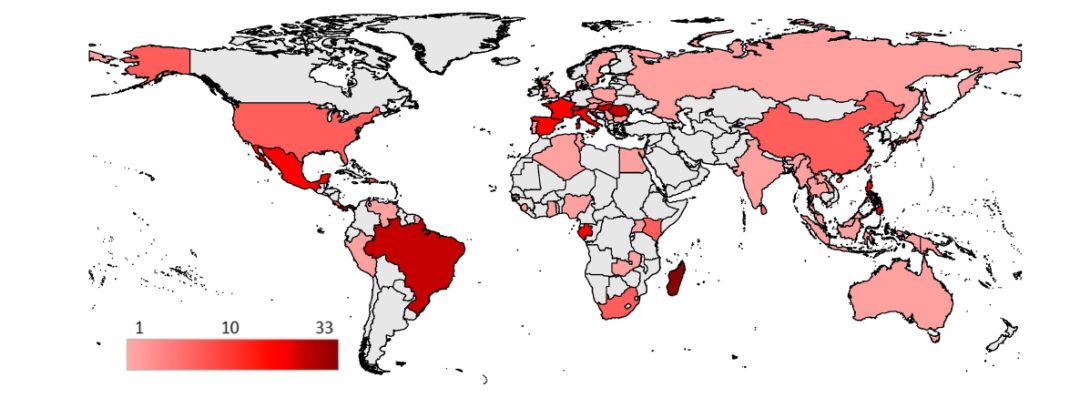 图4. 不同种属蝙蝠的分布范围,颜色越深表示分布越多(Bat Flies and Their Microparasites: Current Knowledge and Distribution)[6]