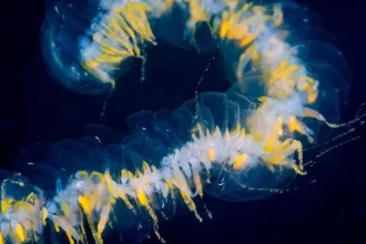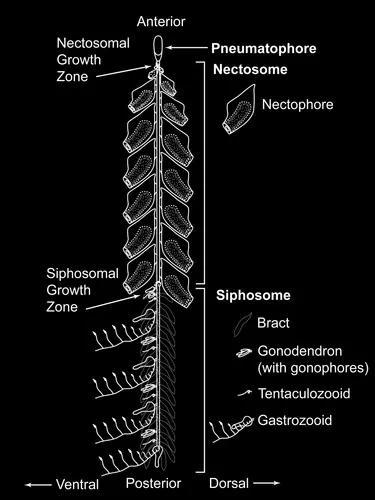 这只属于Apolemia 属的管水母非常复杂,因为严格意义上来说它其并不是一个生命体。相反,它是一种群居生物,由髓状和多形体的游动孢子(zooid)连接组合在一起,聚集成的一个有功能的新生命个体。