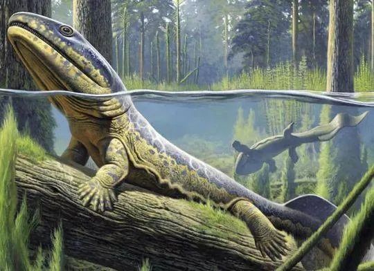 泥盆纪末期的海洋,是一个竞争异常激烈的环境,反观陆地上却是一片生机盎然的乐土:郁郁葱葱的植物铺满大地,其间生活着大量节肢动物。竞争压力和食物的吸引,使得鱼类涉足陆地,演化成布满粘液、笨拙地拖曳着沉重身体在浅沼泥污中艰难爬行的两栖动物。
