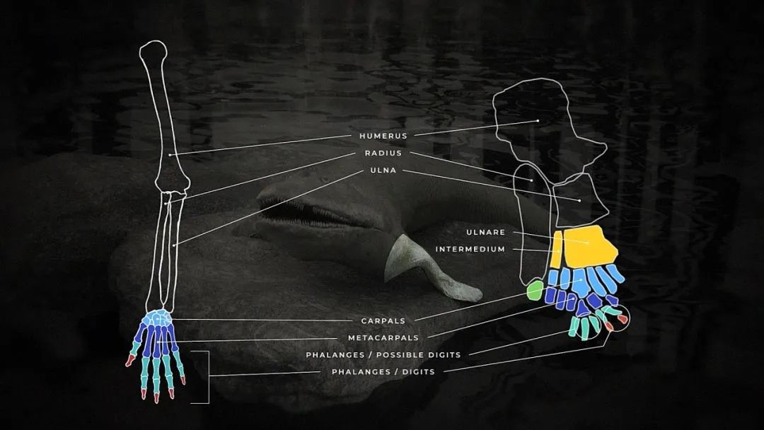 在由鳍条包裹的胸鳍中,不仅可以清晰地看到肱骨、桡骨+尺骨、腕骨和掌骨(相当于人类的大臂、小臂、手腕和手掌),还发现了两根明确的指骨,以及三根可能的指骨。