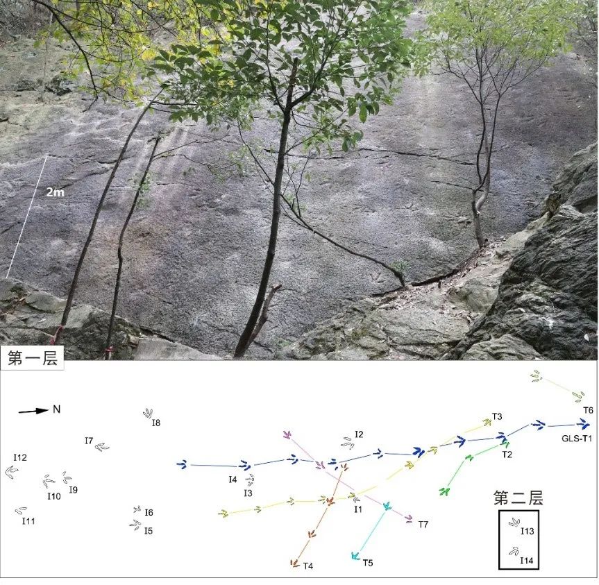 歌乐山国家森林公园发现的恐龙行迹现场图(上)和素描图(下) | 邢立达供图