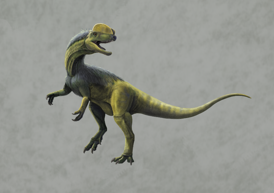 其中我们最熟悉的是曾经在《侏罗纪公园》中出现的双脊龙类,它们最显著的特点是头上长有两个纵向排列的脊冠,体长约4~6米,口中长满了利齿,能够追杀一些大型的植食恐龙。同时,它们的口鼻前端狭窄而柔软,可以灵活地伸进矮树丛中或石缝里把其他小型动物找出来吃掉,是地球上最早出现的大型肉食恐龙之一。