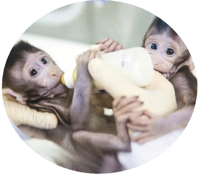 克隆猴“中中”和“华华”在中科院神经科学研究所非人灵长类平台育婴室的恒温箱里。