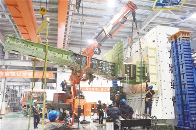 图为科研人员正在安装复材机翼项目典型盒段损伤容限试验件。