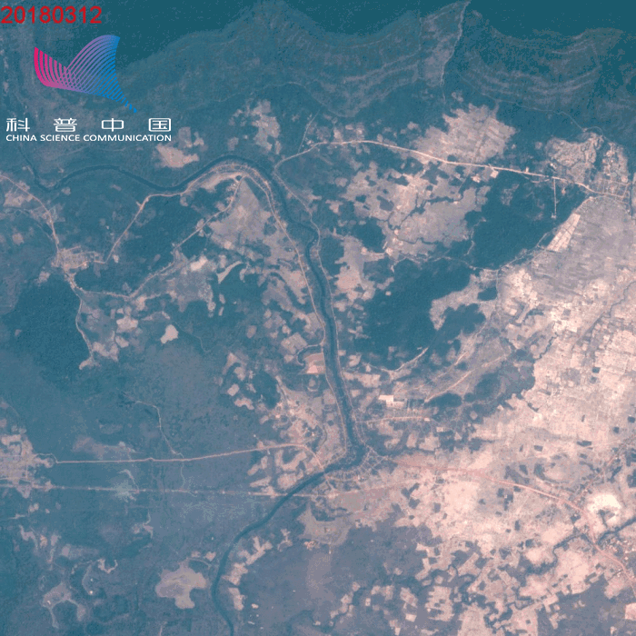 老挝属热带、亚热带季风气候,5月~10月为雨季,11月至次年4月为旱季。卫星图像上显示在2018年3月12日还没有进入雨季的时候的绿色流域已经蓄积了相当多的水。