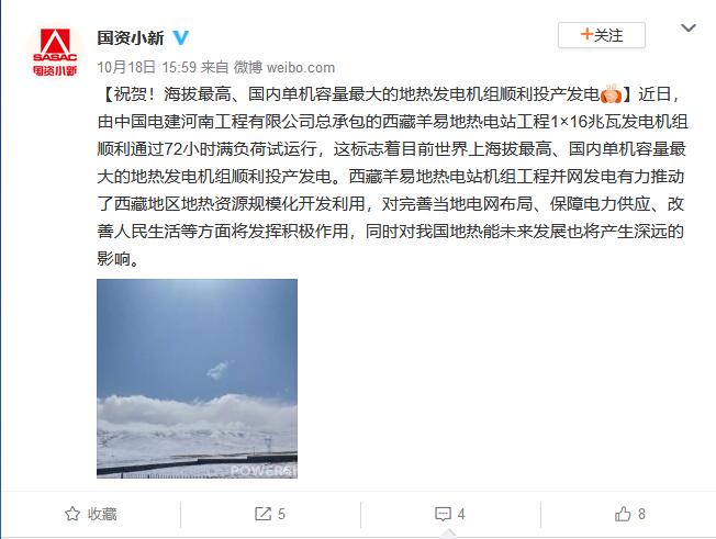 国内海拔最高、单机容量最大的地热发电机组投产环球网 2018-10-19 |
