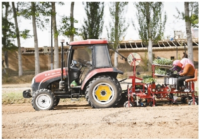图为村民在田间利用北斗导航在自动驾驶状态下播种蔬菜。