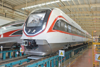 在中车四方生产车间拍摄的我国首列全自动驾驶市域快轨列车。