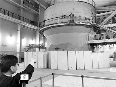 图为近日工作人员在我国第一座重水反应堆前讲述相关历史。记者 陈瑜摄