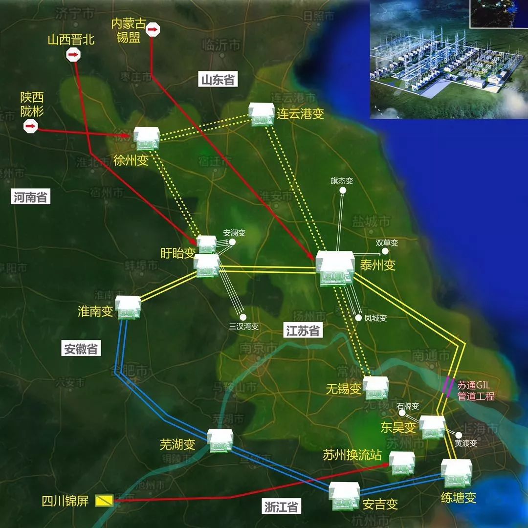 1000千伏特高压交流环网示意图,双黄线和双蓝线所示为环网,红色箭头所示为区外直流输电。注意图中右下侧的苏通GIL管道工程位置跨越了长江。