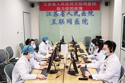 江苏省人民医院互联网医院办公室,医生和信息处的工作人员在工作。新华社发
