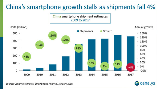 根据Canalys发布的一份最新统计报告显示,2017年中国智能手机市场首次出现年度总出货量下滑的态势。