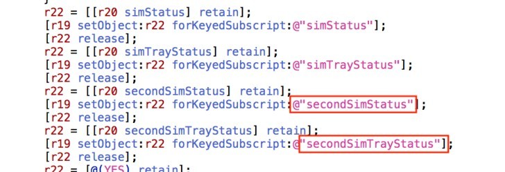 另一段代码中发现了“双卡装置”的信息。这证明苹果正在考虑为下一代移动OS加入双卡功能而打造必要的软件支持。代码中提到第二SIM托盘,这意味着新iPhone有两个实体卡槽,但使用的不是实体 SIM 卡,而是采用 eSIM 的烧号方案。