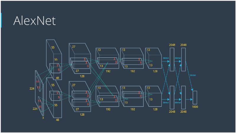 第一届ImageNet 竞赛的冠军 Alex Krizhevsky (NIPS 2012) 由 Yann LeCun 开创的深度卷积神经网络。其结构包括7个隐藏层,不包括一些最大池化层。前5层是卷积层,最后2层是全连接层。每个隐藏层的激活函数是ReLU。这些训练比逻辑单元更快更有表达力。除此之外,当相近的单元有更强的激活值,它还用竞争的归一化来抑制隐藏的活动。这有助于强度的变化。