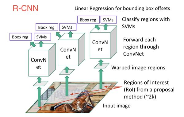 为了处理这种情况,神经网络研究人员已经提出使用区域来代替,在那里我们找到可能包含目标的“blobby”图像区域。这个区域运行起来相对较快。第一个引人注目的模型是 R-CNN(基于区域的卷积神经网络)。在R-CNN中,我们首先使用称为选择性搜索的算法扫描输入图像以寻找可能的目标,生成约2,000个候选区域。然后我们在每个区域框的基础上运行CNN。最后,我们获取每个CNN的输出并将其输入到SVM以对区域进行分类,并使用线性回归来收紧目标的边界框。
