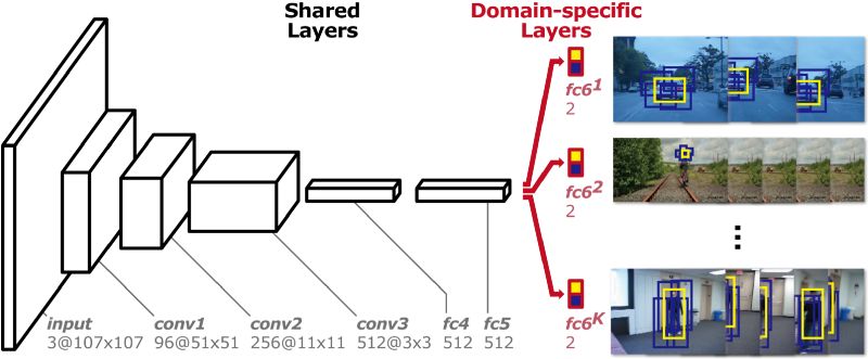 如下所示,MD Net分为两部分:共享层和特定域层的K分支。每个分支包含一个具有softmax损失的二进制分类层,用于区分每个域中的目标和背景,以及共享层与所有域共享以确保一般性表示。