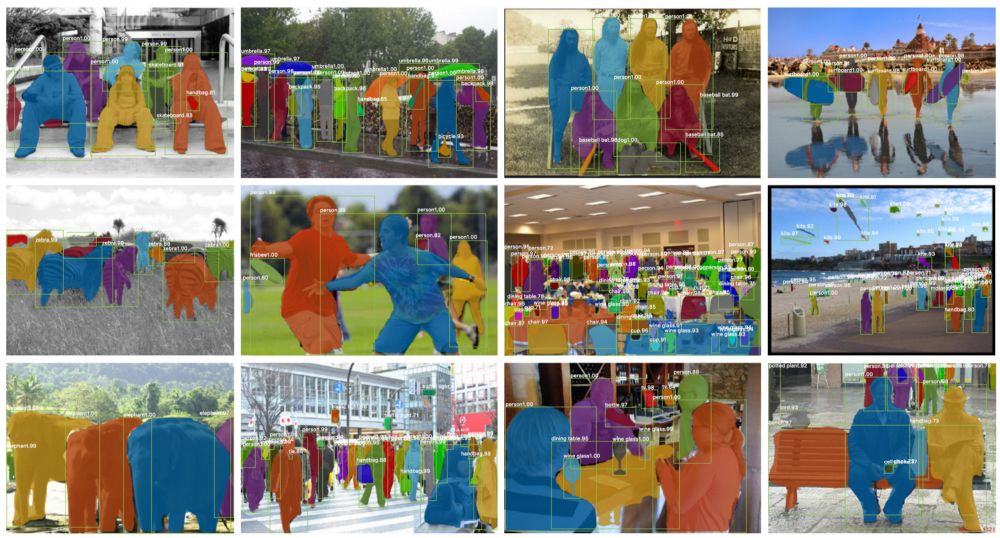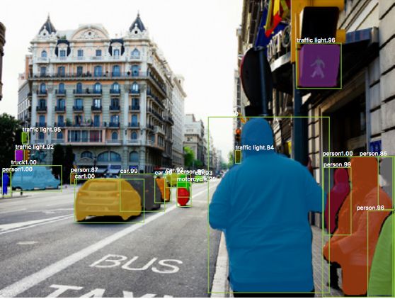 一旦生成了这些掩模,Mask R-CNN将它们与来自Faster R-CNN的分类和边界框组合在一起,以生成如此精确的分割: