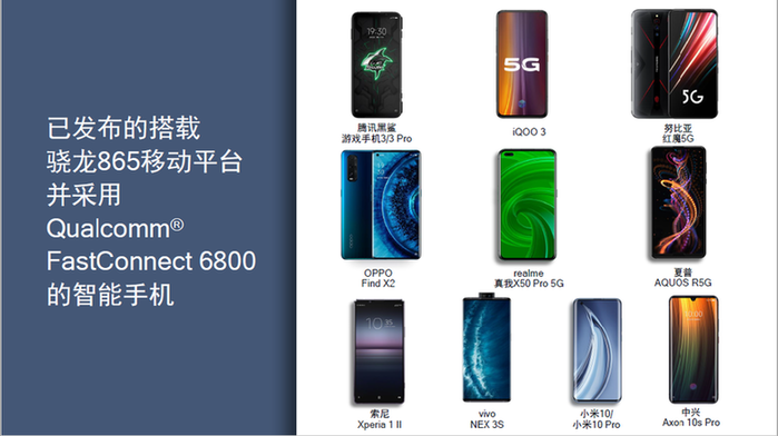 这些机型的Wi-Fi 6特性均得益于骁龙865集成的FastConnect 6800移动连接子系统,其带来了大量的Wi-Fi 6特性创新,即使是在拥挤的网络环境下,家庭中的每一台终端能够充分享受高速率(近1.8Gbps)和低时延的Wi-Fi网络体验。同时,FastConnect 6800也是首批获得Wi-Fi联盟Wi-Fi CERTIFIED 6认证的产品之一。FastConnect 6800子系统集成了非常完整的Wi-Fi 6功能集合,在满足Wi-Fi联盟的要求的基础上,既对基础特性提供支持,又对每个特性进一步实现了极致化提升,从而为我们带来顶级的Wi-Fi 6体验。