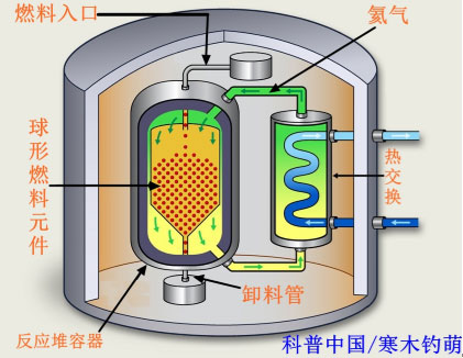 高温气冷堆的顶部是加料口,底部有卸料口,这意味着,即使核电站还在运行,换料时也无须停堆。