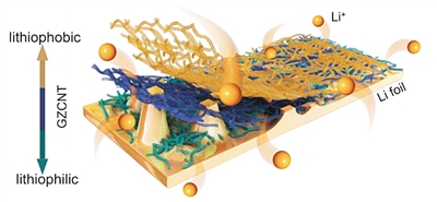 论文第一作者张慧敏介绍,团队巧妙设计出拥有亲锂憎锂“双重性格”的梯度金属锂保护膜,底部是具有亲锂性能的纳米氧化锌/碳纳米管复合层,顶部是憎锂强度高达8GPa的碳纳米管层。该保护膜可以长期有效抑制锂枝晶生长,确保电池获得极高安全性,以及接近100%的充放电效率。