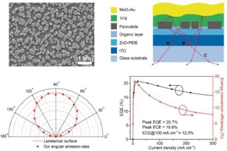该研究负责人黄维院士进一步介绍说,“我们这种特殊的结构就像OLED中的光栅结构一样,可以有效提升器件出光效率,但是它仅仅是通过在钙钛矿前驱体溶液中加入一种氨基酸添加剂自发形成的,这种添加剂一方面可以和底层衬底结合形成一层有机绝缘层,另一方面可以诱导钙钛矿结晶形成低缺陷密度的高质量晶体,从而实现高效率发光。这一成果对钙钛矿LED的发展与应用具有重要的理论意义和实践意义,为进一步推进钙钛矿LED的产业化发展提供了全新思路和途径。”