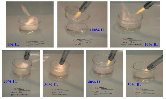 向常用于锂离子电池电解质的有机溶剂中添加40%的离子液体后,溶剂就变得不再易燃,从而大大提高了锂离子电池的安全性。(图片来源:A. Guerfi et al. Journal of Power Sources, 2010)