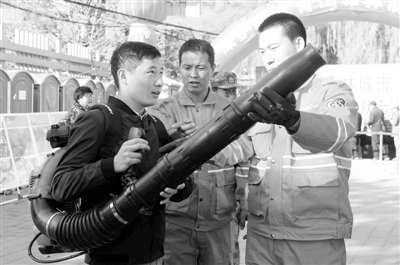 消防员为群众介绍背负式风力灭火机