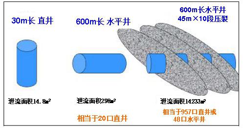 图6直井、水平井、水平井分段压裂泄流面积对比图