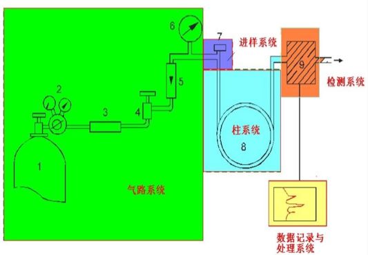 一台气相色谱仪的基本部件由以下五大系统组成:气路系统、进样系统、柱系统、检测系统、数据记录和处理系统。组分能否分开,关键在于色谱柱;分离后组分能否鉴定出来则在于检测器,所以柱系统和检测系统是仪器的核心。如图2为气相色谱仪内部结构简图。