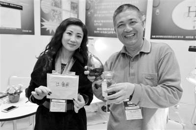 图为水素株式会社技术总监夏晓明(右)展示新型纳米级正极材料“MF-18”。