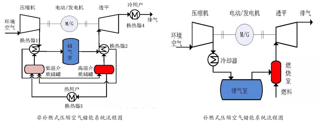 压缩空气储能具有储能密度大、存储周期长、投资成本较少等优点。按照运行方式的不同,压缩空气储能系统可以分为补燃式和非补燃式两大类(如图)。