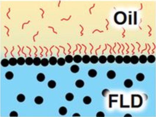 在水油界面,自组装形成的纳米颗粒-表面活性剂会挤满整个界面。图中上半部分表示油相,下半部分表示铁磁液滴(FLD);红色曲线表示表面活性剂 POSS-NH2,黑点表示磁性纳米颗粒 | 图片来源:[1]