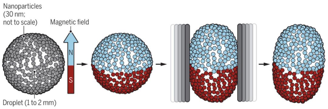 纳米颗粒紧密排列在液滴表面,被外加磁场磁化后即可获得磁性。即使在外力下改变形状,磁性仍不会消失。形状也在外力撤去后得以保持。| 图片来源:[2]