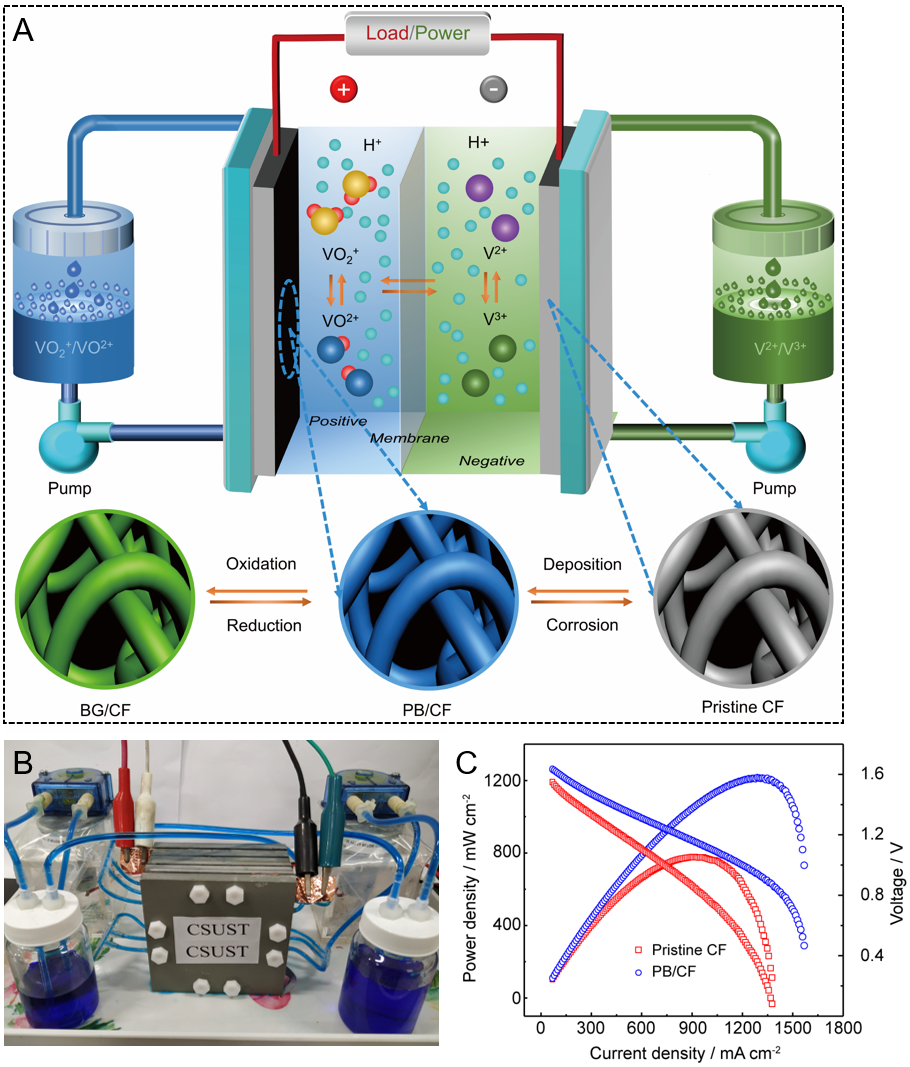 研究团队历时3年,开发了该种普鲁士蓝复合电极,有效提升了钒离子反应活性,从而显著提高了钒液流电池功率密度和能量效率。“用这个复合电极组装的钒液流电池,功率密度较碳毡电极提升了50%以上。在100毫安每平方厘米的电流密度下,能量效率甚至超过88%。”丁美说。
