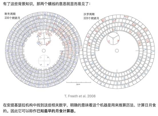 在安提基瑟拉机构中找到这些相关数字,明确的意味着这个机器是用来推算历法、计算日月食的。因此它可以称作已知最早的月食计算器。