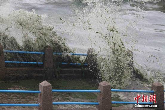 伴着翻滚的浪花,浒苔被拍打上岸。(来源:中新网)