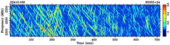 图7 佳木斯66米射电望远镜观测到的脉冲星B0355+54星际闪烁现象(P.F.Wang et al. 2018)。颜色表示脉冲星辐射的亮度,横轴是时间,纵轴是电磁波频率。