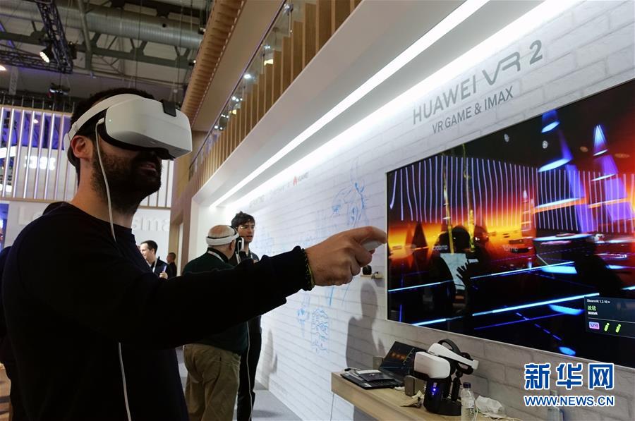 2月28日,在西班牙巴塞罗那,一名男子在世界移动通信大会上的华为展区体验虚拟现实(VR)游戏。 新华社记者郭求达摄