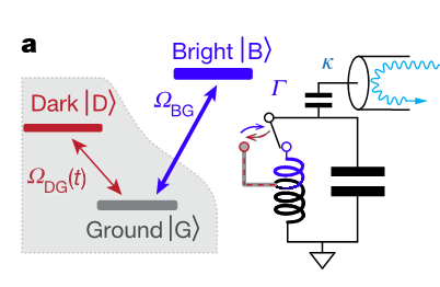 我们来看这篇nature论文里的实验用到的能级图,是一个三能级系统,|G>是基态,|D>是一个激发态,称为暗态(不易受影响的态),|B>是亮态(易操作的态)。这个实验用的是超导电路人工构建的三能级系统,信噪比相比真实的原子能级还要差很多。