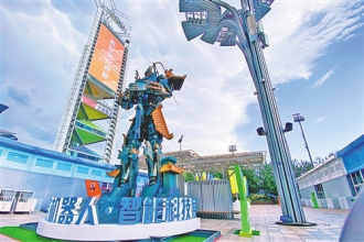 北京奥林匹克公园中轴景观大道室外展馆区的大型机器人模型。2020年中国国际服务贸易交易会将于9月4日至9日在北京国家会议中心举行。本报记者 张 倩摄