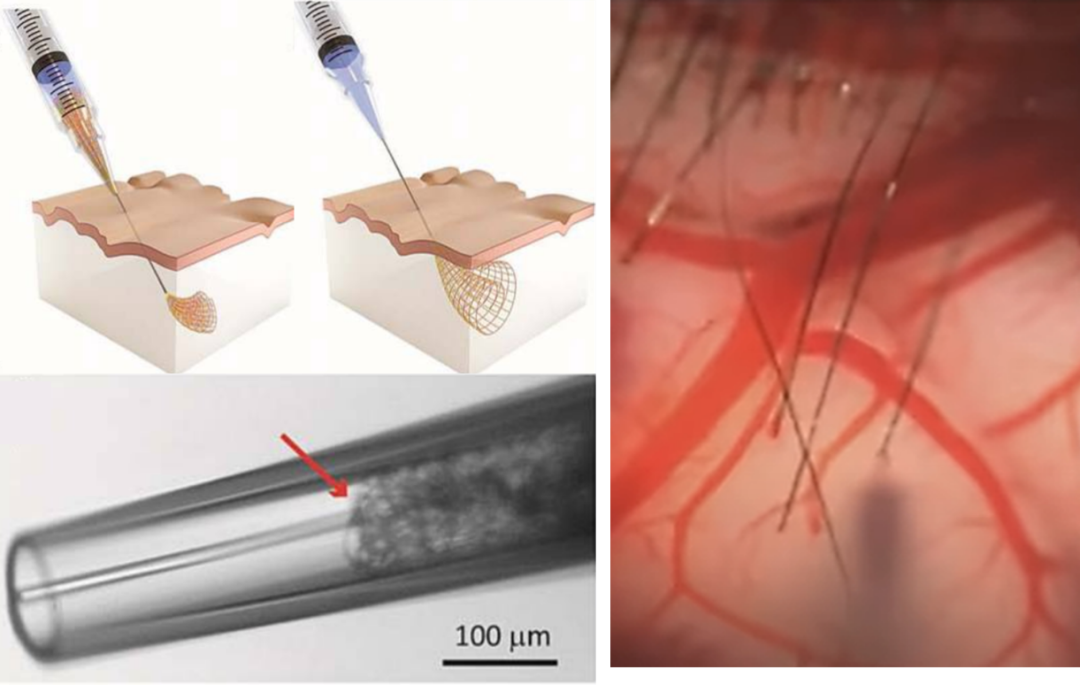 The LINK的核心材料是一种可注射的导电聚合物,右图为该材料与脑部血管对比 |作者整理