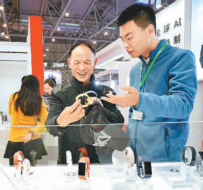 11月18日,观众在安徽合肥国际家用电器暨消费电子博览会上选购智能穿戴产品。