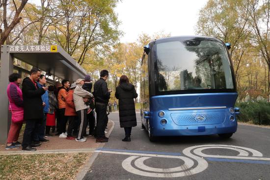 图:在北京某地,乘客们正等待着乘坐百度“阿波罗”无人驾驶汽车。最近,百度与福特汽车启动了为期两年的L4级别自动驾驶联合测试项目,在特定的地理区域和特定天气条件下行驶无人驾驶汽车。
