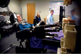 研究人员将两条电极植入她的左侧运动皮质,这是大脑信号向下传到脊髓控制手臂肌肉之前的最后一站。研究人员检测她皮质里的电活动,用计算机翻译理解她的意图,然后用她大脑的输出来控制一条全世界最先进的机械手臂。