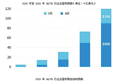 根据预测,AR/VR行业到2020年总盈利规模将达到1200亿美元,AR占比75%。从地域结构上看,亚洲国家将切分50%的市场蛋糕,中国、日本、韩国、印度有望成为AR/VR的主要市场。