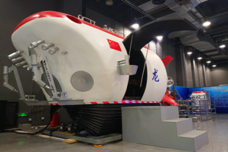 说到深海载人潜水器,哪能少了战功赫赫的“蛟龙号”,在“深海勇士”前方不远处,就有一只大鹏展翅状的“蛟龙号”雄踞在此,size着实比“深海勇士”大了好几倍。