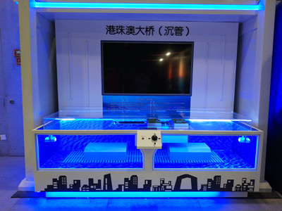 此外,左手边还有一个专门针对港珠澳大桥的沉管结构所设计的互动式展项,观众可动手操作观察沉管的原理。