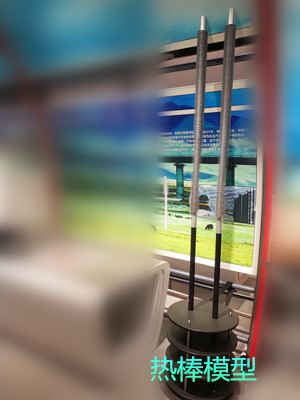 热棒这一结构采用液氨作为工质材料,地下部分5米,地面露出2米,热棒下部的液氨温度较低,能够吸收路基中多余的热量。液氨吸热后会汽化,由于体积膨胀,会向热棒顶端移动。热棒顶端露出地面,并装有散热装置,由于空气温度较低,加之蒸气压的作用,氨将热量散至空气中,自身重新变为液态回流至管底。通过汽化液化过程的循环,热棒不断将路基的热量散至空气中,保护了青藏高原冻土的稳定。