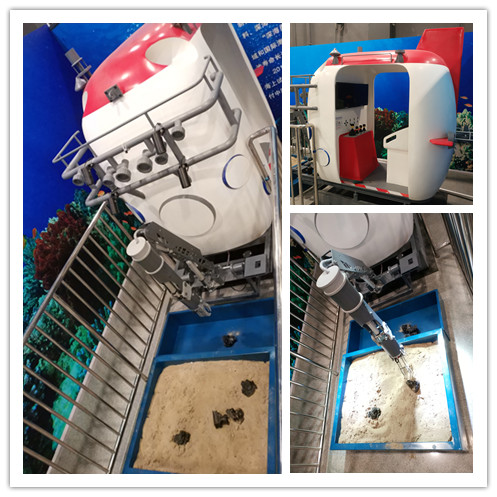 该展项是互动性展品,观众可以亲自操作“深海勇士”机械臂,观察潜水器是如何进行机械操作的。小小透露一下,本次展览中还有一位和“深海勇士”一起下过水的“好兄弟”也来到了现场,它可是顶住了超过16000吨海水压力的幕后英雄,圆满完成为潜水器保驾护航的使命。此时,它正在展厅的某个角落静候膜拜,学姐就不po图了,提示个关键词:大肚子。
