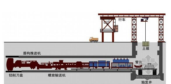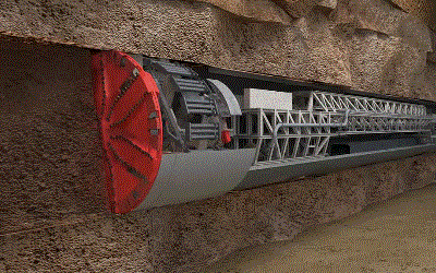 盾构机的基本原理是盾体沿着线路方向,利用旋转刀盘上的刀具对岩土进行挤压、破碎或切割向前掘进;盾体对挖掘出的还未衬砌的隧洞起临时支撑的作用,承受周围土层的压力或地下水压,并将地下水挡在外面。切削下来的碴土由排土机构运至地面,同时,盾构机每掘进一环的距离,管片拼装机就准确拼装衬砌管片,使隧道—次成型。